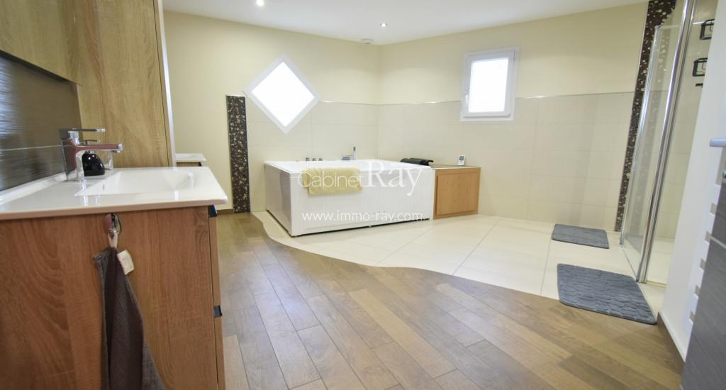 - Salle de bains 8 m² carrelée (baignoire + 2 vasques + radiateur sèche-serviettes).