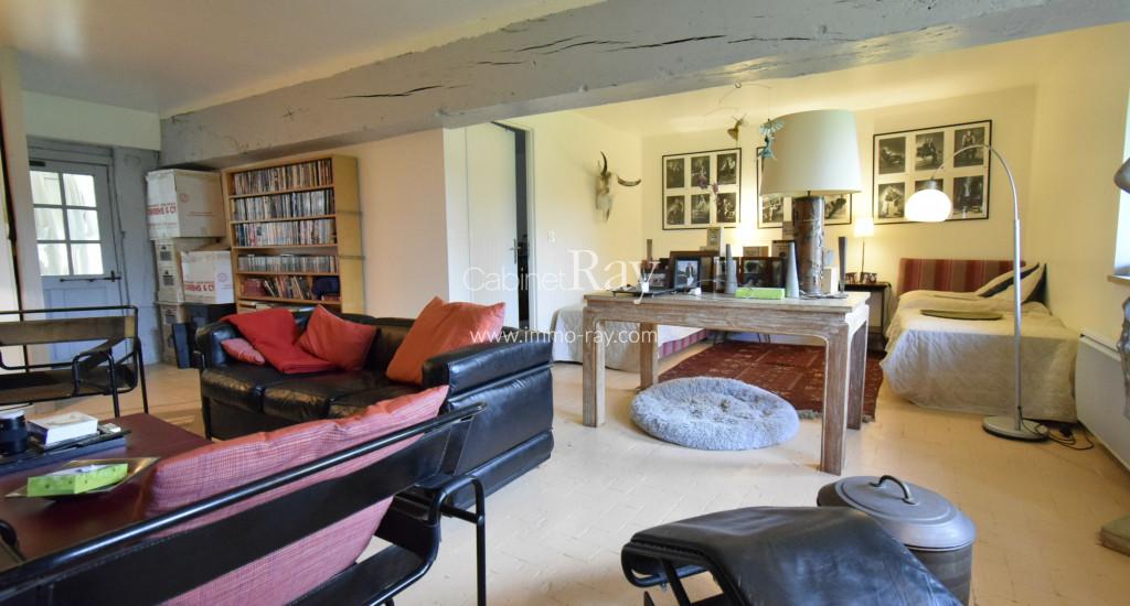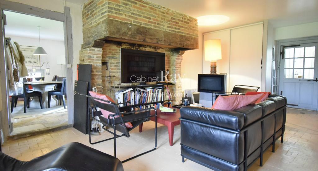- Salon communicant 40 m² carrelé – Cheminée – Poutres apparentes.