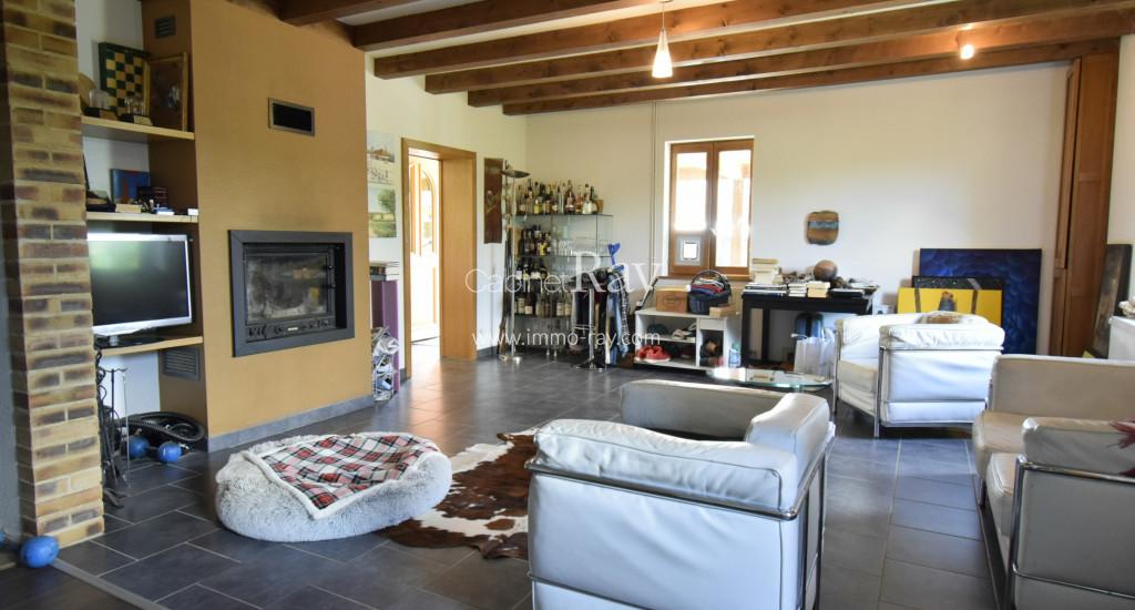 - Séjour-salon 50 m² tomettes – Poutres apparentes – Poêle à bois.