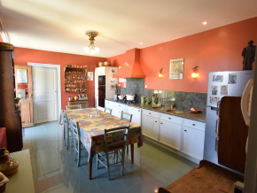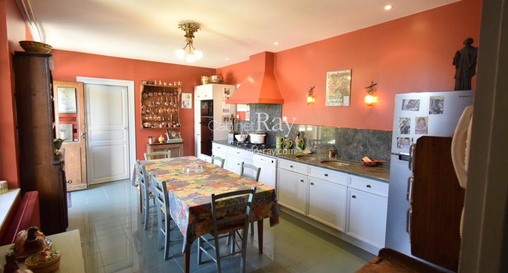 - Cuisine-coin repas 26 m² tomettes – Poutres apparentes (Eléments de rangement + électroménager) + arrière-cuisine avec accès sur galerie couverte côté est.