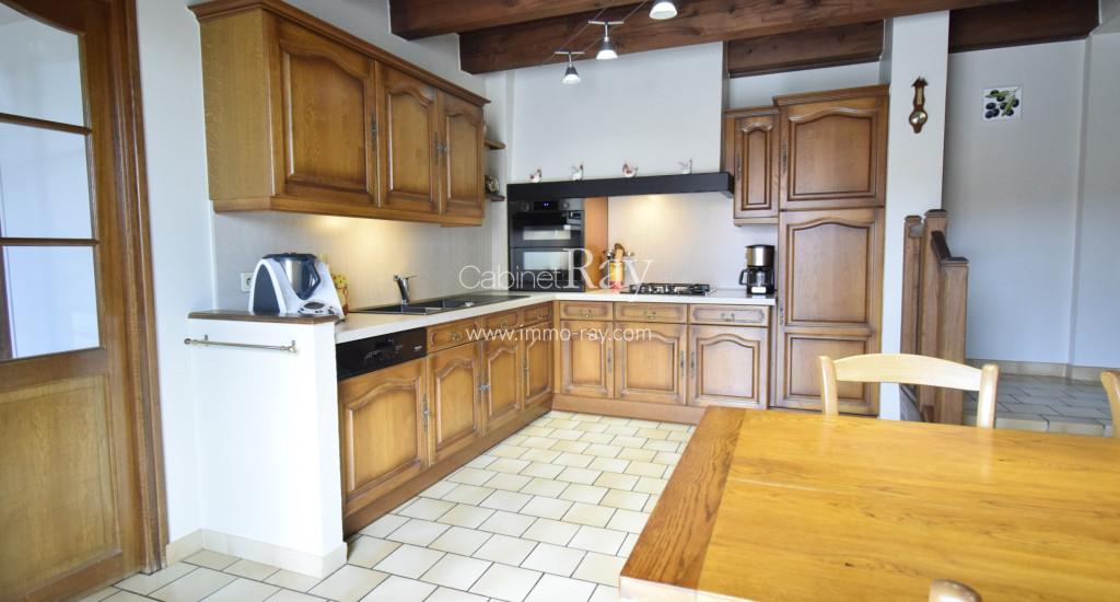- Cuisine-séjour 24 m² carrelée. Eléments de rangement – Pierres apparentes.