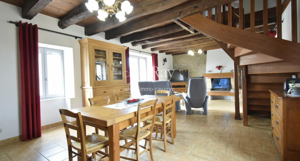 - Salon 27 m² tomettes – Poutres apparentes – Cheminée + poêle à bois.