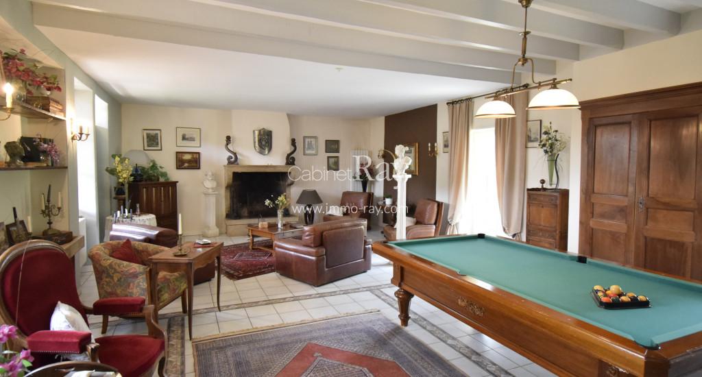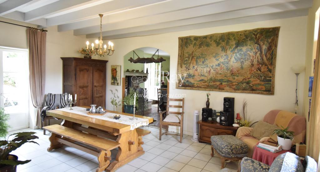 - Salon 49 m² carrelé – Pierres et poutres apparentes.