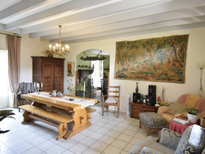- Salon 49 m² carrelé – Pierres et poutres apparentes.