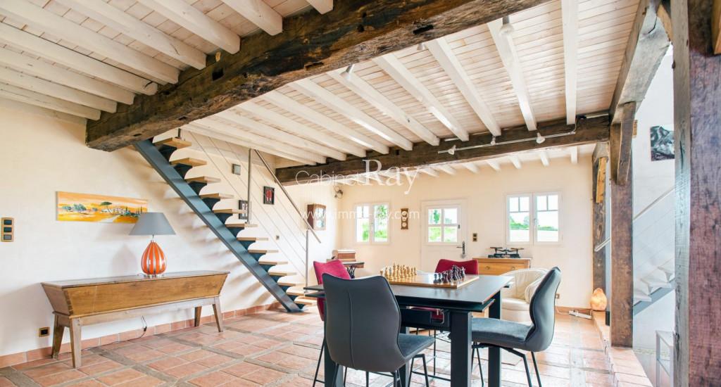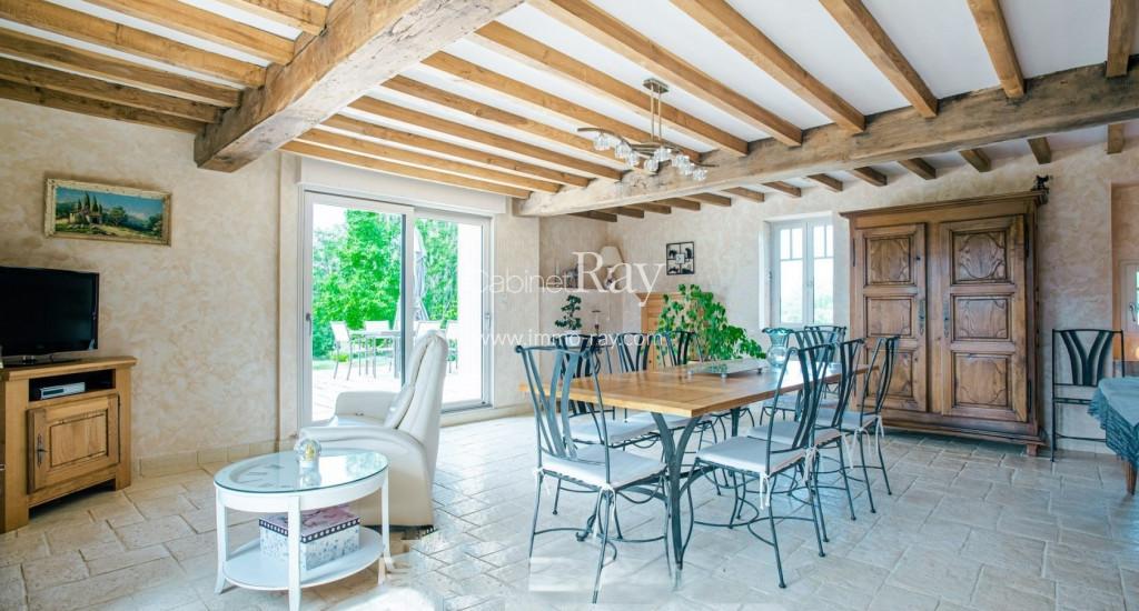 - Salon communicant 40 m² carrelé – Cheminée – Poutres apparentes.