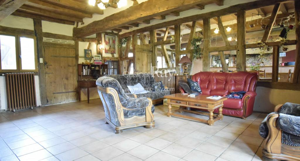 - Séjour 40 m² pierres reconstituées – Cheminée – Poutres apparentes.