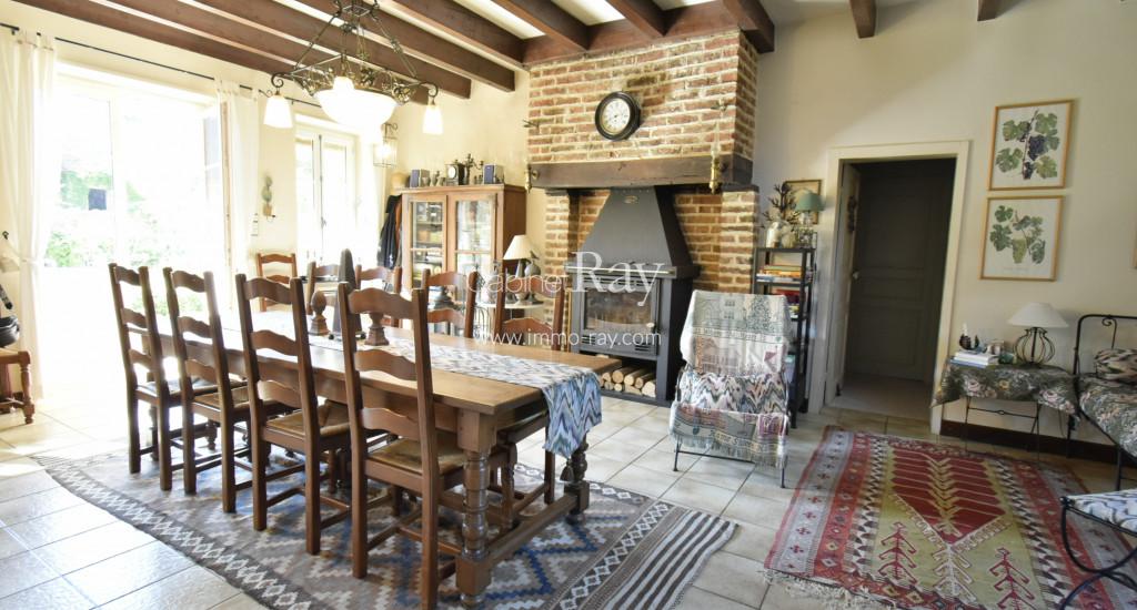 - Séjour – salon 22 m² carrelé - Cheminée + poêle - Poutres apparentes.