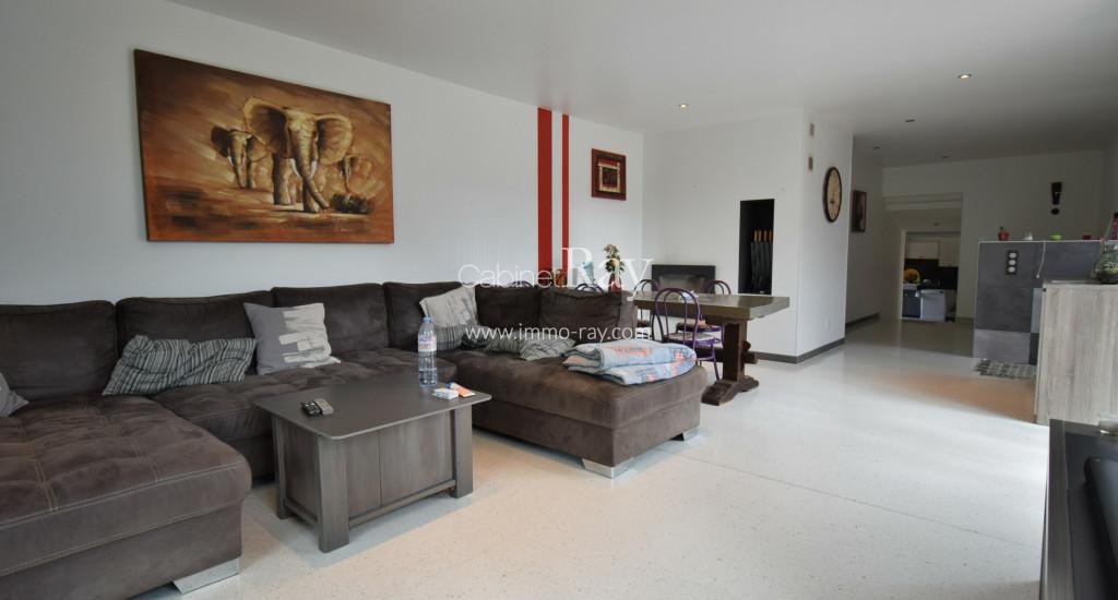 - Salon 30 m² carrelé – Poutres apparentes – Poêle à bois + montée escalier.