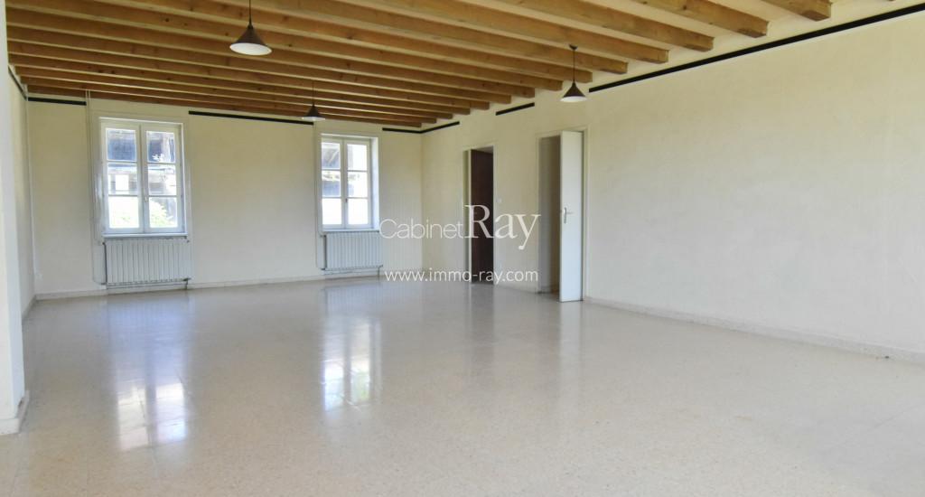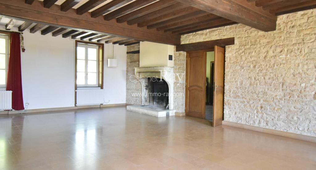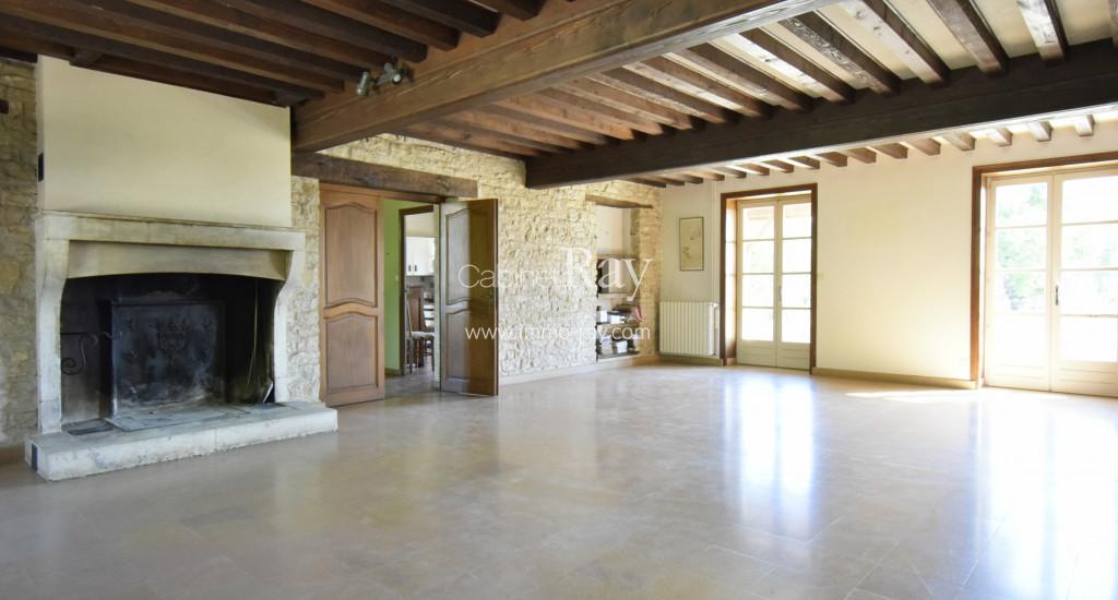 - Grande pièce à vivre 32 m² tomettes – Poutres apparentes – Cheminée.