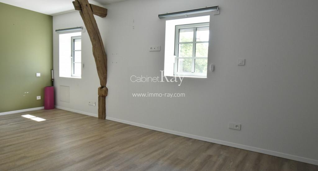 - Salon 42 m² parquet – Poutres apparentes – Poêle à bois.