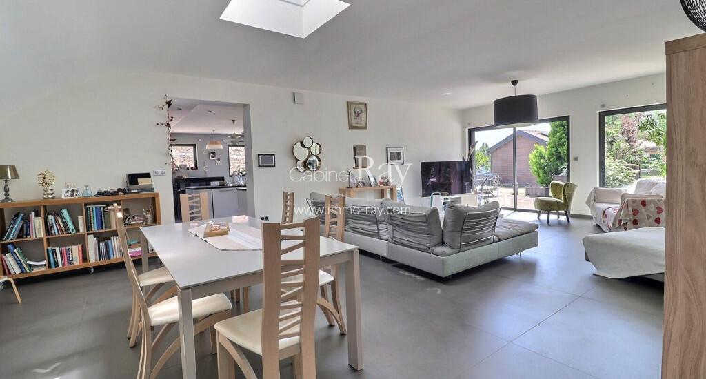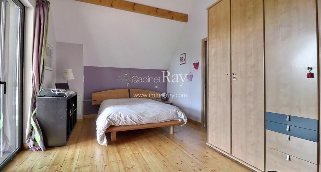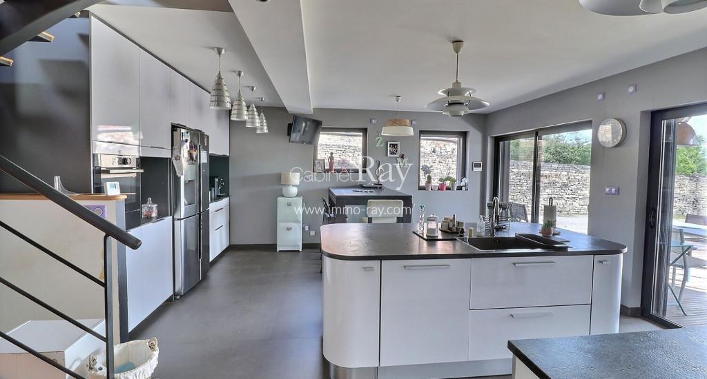 - Cuisine 40 m² carrelée toute équipée. Cheminée communicante insert.