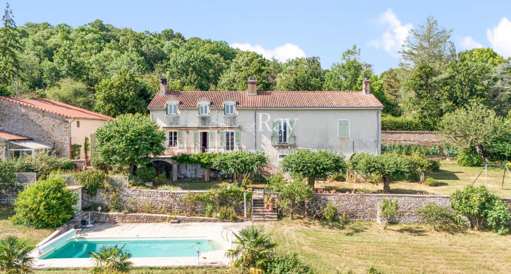 Une belle grange en pierre rénovée composée d’un logement principal 155 m² environ – 3 chambres + mezzanine usage salon –, atelier, remise, piscine hors-sol, cour et jardin, le tout sur 330 m² environ.