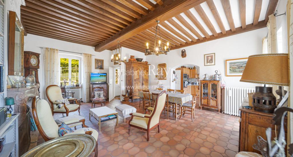- Salon 30 m² carrelé – Poutres apparentes – Poêle à bois + montée escalier.