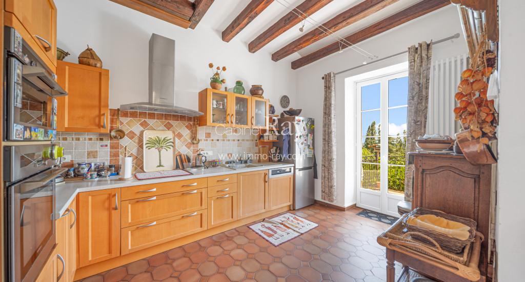 - Cuisine-séjour 26 carrelée – Poutres apparentes (Eléments de rangement – plaque – hotte – four).