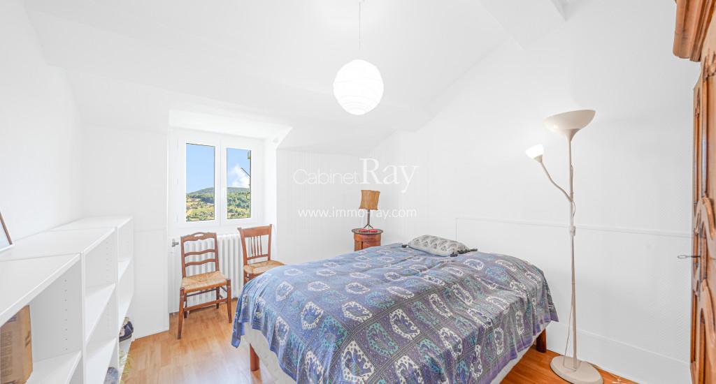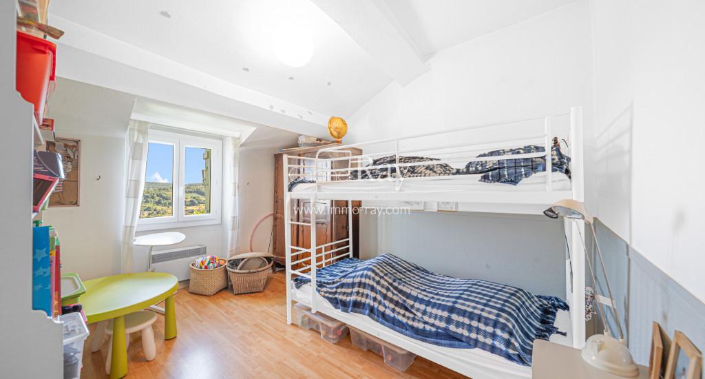 - Séjour-salon 38 m² carrelé + parquet partiel + poêle à bois.