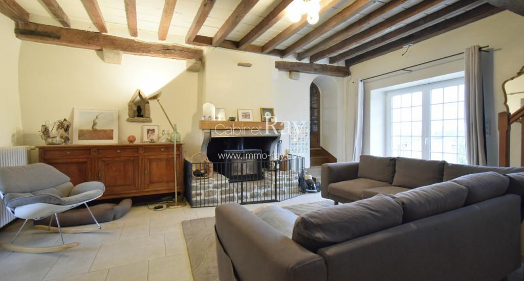 - Grande pièce à vivre 32 m² tomettes – Poutres apparentes – Cheminée.
