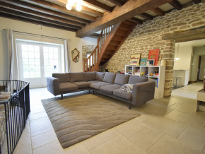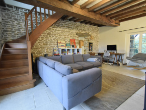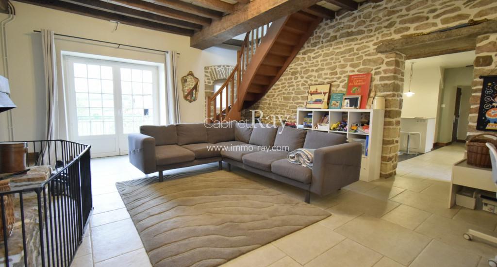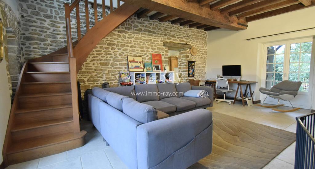 - Salon 30 m² carrelé – Poutres apparentes – Poêle à bois + montée escalier.