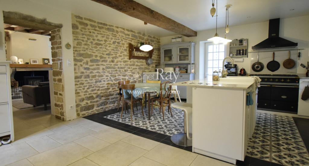 Une belle grange en pierre rénovée composée d’un logement principal 155 m² environ – 3 chambres + mezzanine usage salon –, atelier, remise, piscine hors-sol, cour et jardin, le tout sur 330 m² environ.