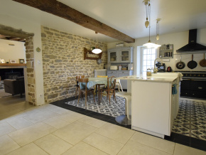 - Cuisine-séjour 26 carrelée – Poutres apparentes (Eléments de rangement – plaque – hotte – four).