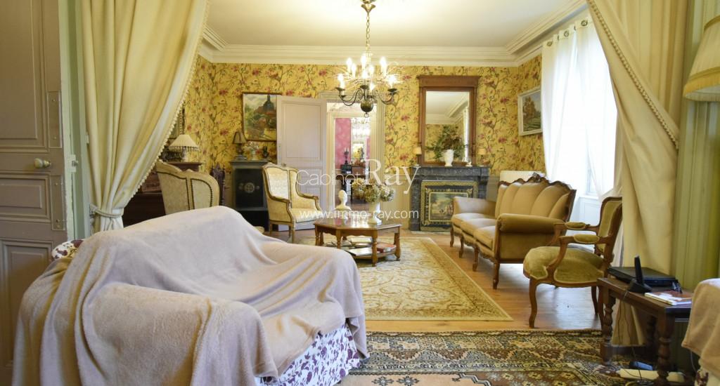 - Séjour 26 m² carrelé – Poutres apparentes – Cheminée + poêle.