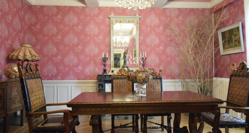 - Salle à manger 23 m² carrelée – Poutres + pierres apparentes.