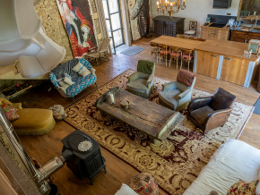 - Salon-bibliothèque 21 m² carrelé – Poutres apparentes – Cheminée + poêle à bois Jotul.