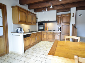 - Cuisine-séjour 24 m² carrelée. Eléments de rangement – Pierres apparentes.
